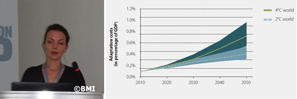Anne Olhoff en la presentación del “Informe sobre la disparidad en las emisiones” durante la COP 20 en Lima (izq.) y un gráfico que muestra el costo de adaptación estimado en porcentaje del PIB de los países en desarrollo entre 2010 y 2050, comparando un mundo de 2 °C con uno de 4 °C (dcha.).