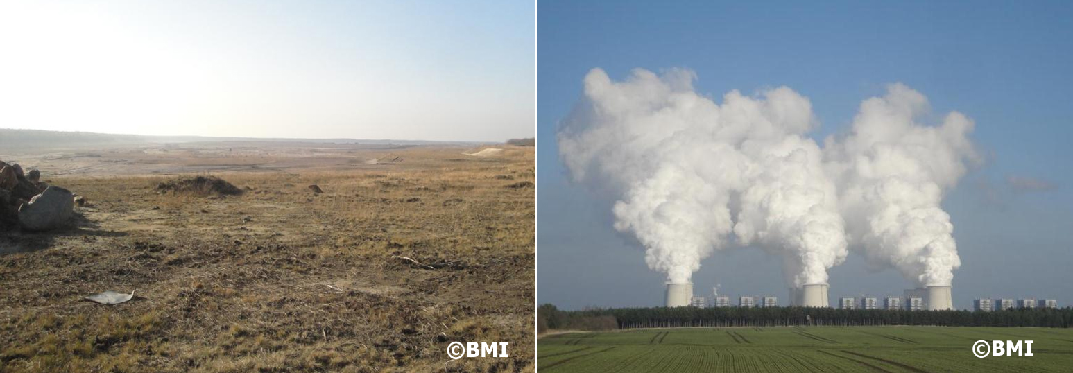 Paisaje devastado por una mina de lignito a tajo abierto (izq.) y una central térmica en base a lignito (dcha.) en la región alemana de Lusicia.